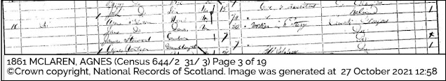 I also noted that on Mary’s death certificate, that her mother was not recorded as deceased, which prompted me to look again for Agnes McLaren/McLellan on the 1851 and 1861 census.